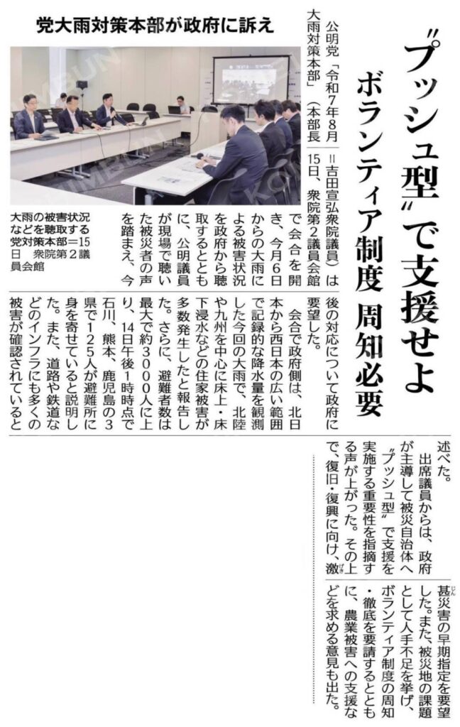 公明党「令和7年8月大雨対策本部」が15日、議員会館で行われ、オンライン参加しました。