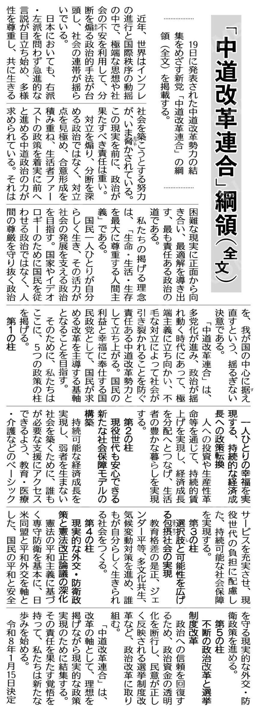 お知らせ 公明新聞:中道改革連合 綱領(全文) 2026.01.20 2026.02.12 Tweet Share この記事のタイトルとURLをコピーする 2026年1月20日 公明新聞 2面 「中道改革連合」綱領(全文) Tweet Share