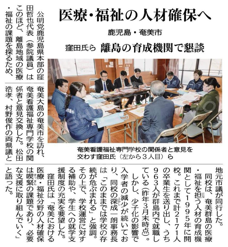 お知らせ 公明新聞:医療・福祉の人材確保へ 2026.01.08 Tweet Share この記事のタイトルとURLをコピーする 2026年1月8日 公明新聞 6面 医療・福祉の人材確保へ 窪田氏ら、離島の育成機関で懇談 鹿児島・奄美市 Tweet Share